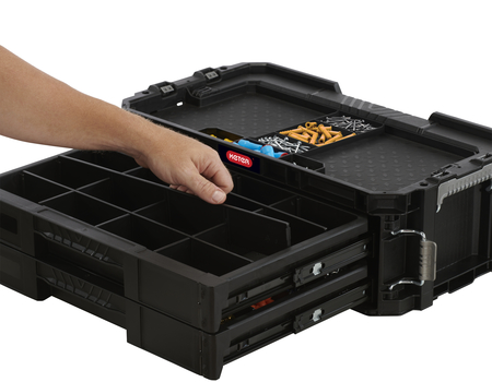 Box Keter Connect využijete pro uskladnění pracovních pomůcek. Uschovejte v něm malé nástroje, díly a další řemeslné potřeby. Díky 2 zásuvkám je rychle najdete a máte je po ruce, kdykoliv potřebujete. Úložný prostor si přizpůsobíte pomocí vyjímatelných přepážek, kterými oddělíte šroubky od matic a jiného drobné náčiní.