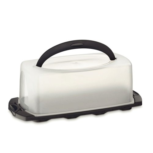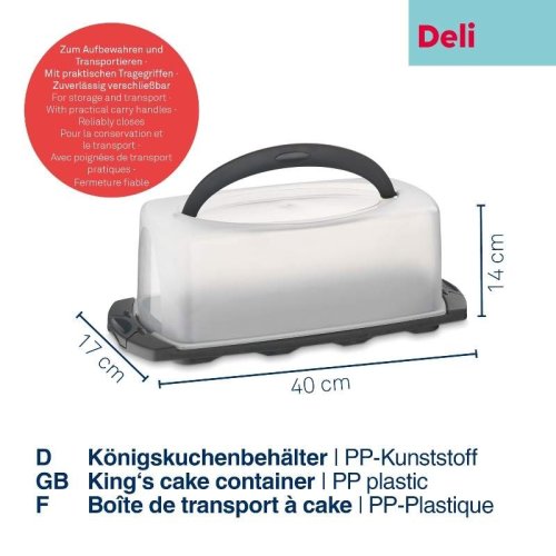 • přenosný box na potraviny, ideálně na buchty a moučníky- víko se sklopnými rukojeťmi, šetří místo při převozu nebo skladování- spolehlivé uzavření víka na klipsy pro bezpečné přenášení a transport- barva: transparentní / antracit- materiál: PP plast- rozměry: 40 x 17 x výška 14,5 cm