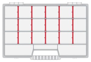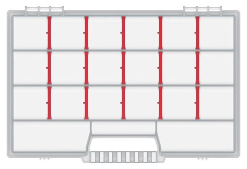 Průhledný organizér. Rozměry: 290x195x35 mm Počet přihrádek: 21 Hmotnost: 251 g Materiál: Plast Množství v balení: 15 ks