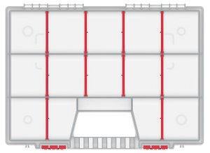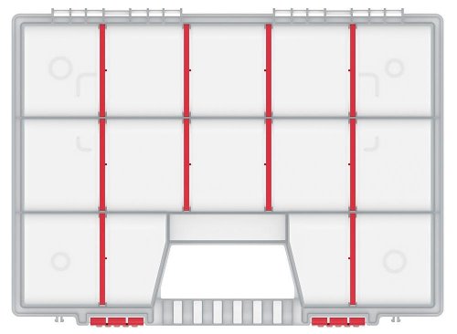 Průhledný organizér. Rozměry: 390x290x65 mm Počet přihrádek: 15 Hmotnost: 590 g Materiál: Plast Množství v balení: 10 ks