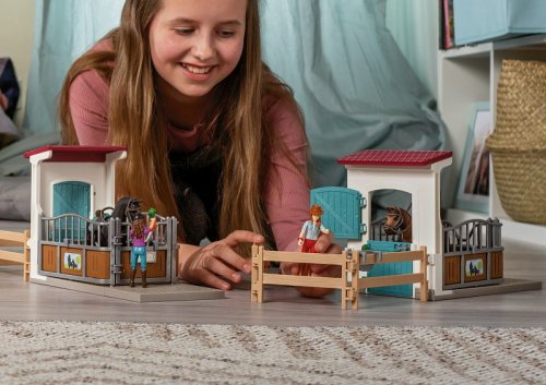 Vyčerpaná, ale šťastná Lisa a její krásný hannoverský valach klusají zpět do stájí. Právě dokončili společný trénink. Pro oba to byla velká zábava, ale také to bylo trochu vyčerpávající. Proto si Storm, nádherný valach, smí zatím odpočinout. Lisa svižně sesedne ze sedla a otevře dveře do boxu. Uvnitř si sundá přilbu a vede Storma do jeho domova. Obratně rozepne popruhy a sundá svému věrnému společníkovi sedlo a uzdu. Je čas si odpočinout! Rozměry modelu: 19 x 24,5 x 8,2 cm. Věk: 5-12