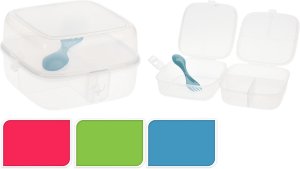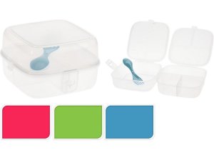 Box svačinový 15,5 x 15 x 9,5 cm s klick uzávěrem, dělený + příbor PH, TRA / mix barev.