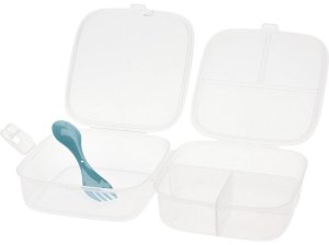 Praktický dělený svačinový box s příborem, je vhodný na svačiny do školy, do práce či na výlety.