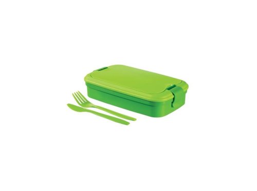 Cestovní plastový svačinový box s vidličkou a nožem. V boxu se nachází speciální přihrádka, kterou lze snadno vyjmout.