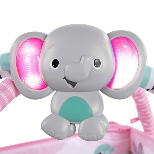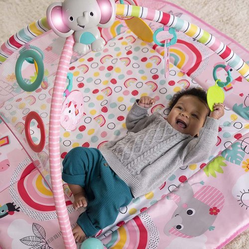 Když dítě vyroste, může si samo procvičovat motorické dovednosti pouštěním míčků ze stříšky nebo kutálením či podáváním míčků sem a tam! Pro menší miminka se hrací deka rozloží celá, kde děťátko může strávit čas na zádíčkách a hrát se s hračkami na hrazdičce nebo se s nimi zahrát na bříšku při podpoře s polštářkem, který je také součástí. Veselý sloník svítí a hraje hudbu více než 20 minut a samozřejmě si ho můžete vzít s sebou i na cesty. Pozornost děťátka samozřejmě upoutají i další hračky y jako Provlékačka s korálky, hračka jednorožce, bezpečné zrcátko, barevné karty, kousátko ve tvaru listu a chrastítko s korálky. Hurá za zábavou!