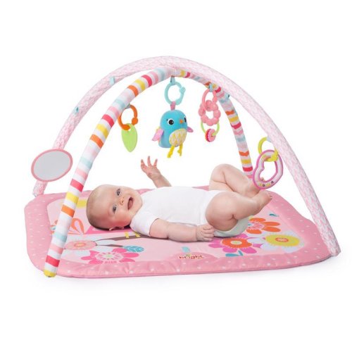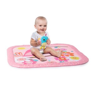 Hravé místo, které dopřeje vašemu miminku zábavu a hodně her podporujících jeho rozvoj a smyslovou stimulaci. Stačí zmáčknout hračku, která hraje 4 sladké melodie nebo zachrastit chrastítkem. Součástí je i bezpečnostní zrcátko, které podporuje u miminka sebepoznání. Hračky jsou přizpůsobeny i na přenášení a můžete je připnout k většině autosedaček a kočárků. Okouzlí vás i krásný design deky plný pestrých barev. Deka se snadno udržuje v čistotě a lze ji prát v pračce. Odnímatelné hrazdičky umožní deku jednoduše složit a uskladnit, tak aby nezabrala mnoho místa.