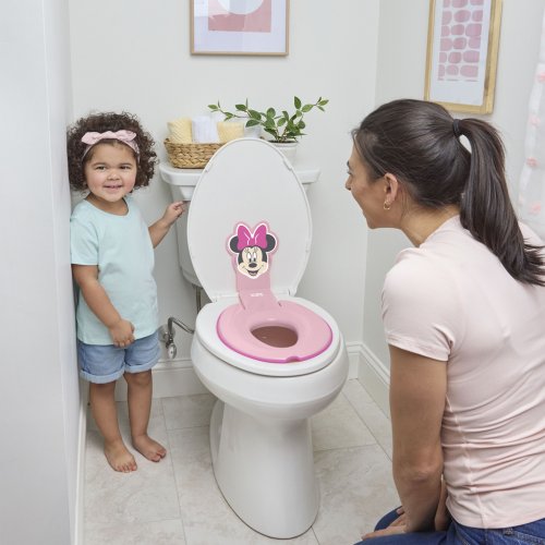 Zábavné a hygienické učení na nočník s oblíbenou Minnie! Usnadněte svému děťátku přechod z plenek na velký záchod s pomocí roztomilé a praktické tréninkové desky Flip&Sit s motivem Minnie Mouse od Bright Starts. Tento šikovný pomocník se jednoduše připevní na běžné WC – bez nářadí, během pár vteřin jej můžete odlepit, přilepit a hotovo! Flip-up systém umožní, že redukci jednoduše vyklopíte nahoru, když ji zrovna nepotřebujete. Ať už jste v procesu učení na nočník nebo se na něj jen připravujete, redukce Flip&Sit Minnie Mouse přinese koupelně styl, čistotu a hlavně motivaci pro malé učící se hrdiny. Ideální řešení pro menší koupelny, bez zbytečného nočníku na zemi. Žádné vylévání obsahu jako u klasického nočníku – stačí spláchnout a jede se dál!