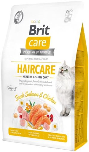 BRIT CARE CAT GRAIN-FREE HAIRCARE. HEALTHY & SHINY COAT. HYPOALERGENNÍ RECEPTURA "ČERSTVÝ LOSOS & KUŘE".
