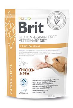 Brit Gluten & Grain-Free Veterinary Diet Cardio Renal je speciálně formulované veterinární krmivo určené pro psy trpící chronickým srdečním nebo ledvinovým onemocněním. Granule obsahují střední množství vysoce kvalitních bílkovin a nízký obsah fosforu, který napomáhá zpomalit progresi chronického onemocnění ledvin. Nízký obsah sodíku přispívá ke snížení zadržování tekutin a odlehčení srdečnímu svalstvu. Díky obsahu L-karnitinu, taurinu a argininu podporuje správnou činnost srdečního svalu, zatímco omega-3 mastné kyseliny EPA a DHA mají protizánětlivý a kardioprotektivní účinek. Krmivo je obohaceno o přírodní antioxidanty, prebiotika a postbiotika, které pomáhají udržovat rovnováhu střevní mikrobioty a posilují imunitní systém. Neobsahuje lepek a je vhodné i pro psy s citlivým trávením. Krmivo je určeno pro psy: