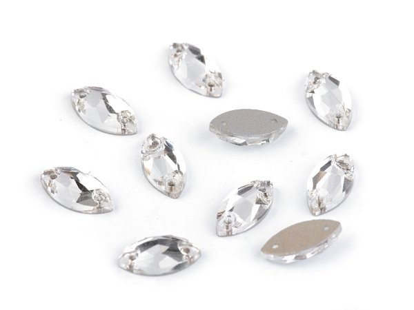 Precizně broušené kamínky se efektně třpytí. Kamínky mají tvar navetky a v každém jsou dva otvory, které umožňují snadné našívání. [Na rubové straně jsou opatřeny krycí barvou, která zabraňuje zbarvení dle přiloženého podkladu.] Využijete je při výrobě šitých šperků nebo zdobení oděvů. Dokonale vyniknou na společenských šatech, halenkách a doplňcích, jako jsou kabelky, psaníčka, klobouky apod.