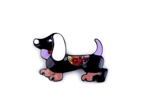 Brož jezevčíka s barevným smaltem je doplněk, který okamžitě upoutá pozornost.
