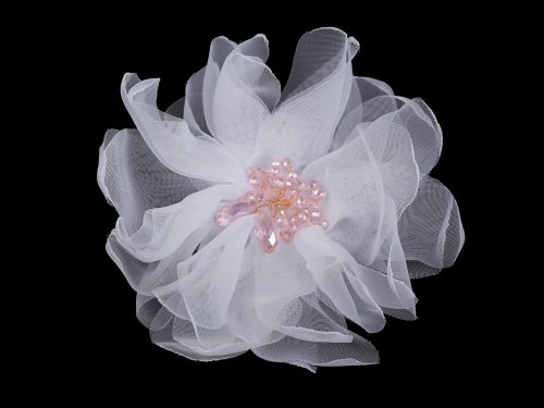 Romantická textilní brož květu z organzy má bohaté okvětní plátky, je jemně nadýchaná. Ve středu je ozdobená broušenými korálky, díky kterým se nádherně třpytí. Vzadu má brožový špendlík, květem si můžete ozdobit šaty, halenku, sako, klobouk i kabelku.