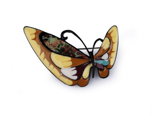Brož motýla s barevným smaltem je elegantní a působivý doplněk, který dokáže oživit každý outfit. Je zpracována s důrazem na detail, což umocňuje její estetickou hodnotu. Z rubu má brožový špendlík. Můžete ji nosit nejen na oděvech, hodí se i k ozdobení klobouků, tašky či sepnutí šátku. Je skvělým dárkem pro každého, kdo ocení originální a hravé módní doplňky. Brož je na plastové kartě, kterou lze zavěsit na prodejní stojany.