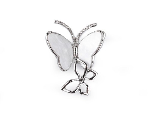 Brož dvou motýlů je elegantním módním doplňkem. Větší motýl má křídla ozdobená imitací perleti, tykadla má osázená drobnými broušenými kamínky, které se krásně třpytí. Zapíná se pomocí brožového špendlíku. Brož můžete nosit nejen na oděvech, ale hodí se i k ozdobení klobouků, tašky či sepnutí šátku. Je na plastové kartě, která se dá zavěsit na prodejní stojan.