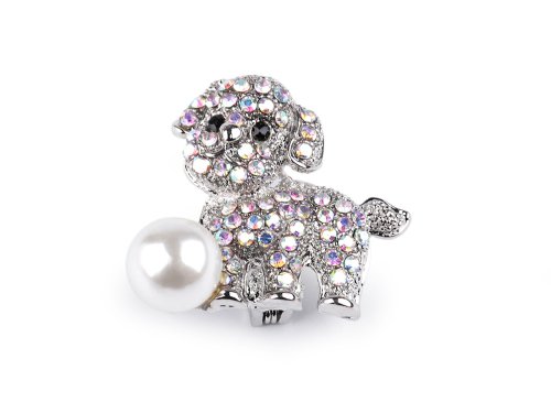Kovová brož pejska je po celém povrchu osázená třpytivými broušenými kamínky. Díky nim působí brož roztomile, ale zároveň elegantně. Můžete s ní ozdobit oděvy i doplňky jako jsou šátky, klobouky, tašky apod. Zapíná se pomocí brožového špendlíku. Brož č.2 je ozdobená perlou. Brož je na plastové kartě, která se dá zavěsit na prodejní stojany.