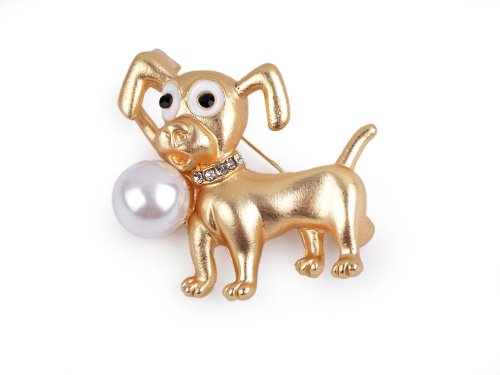 Metalická kovová brož roztomilých pejsků je decentně doplněná broušenými kamínky a perlou. Působivě vám dozdobí oděvy i doplňky (tašky, klobouky, šátky.). Zapíná se pomocí spínacího špendlíku. Brož je na plastové kartě, která se dá zavěsit na prodejní stojany.