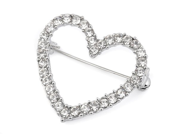 Romantická brož ve tvaru srdce či květu je ozdobená broušenými kamínky, které se třpytí. Zapíná se pomocí spínacího špendlíku, na kterém je pojistka proti nechtěnému otevření. Brož můžete nosit na oděvech, kloboucích, taškách či s ní můžete sepnout šátek. Náš tip: broží můžete ozdobit svatební kytici, stuhy na židlích pro novomanžele nebo třeba svatební kroužky na ubrousky.
