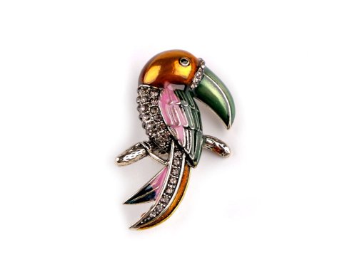 Brož tukana s barevným smaltem je elegantní, můžete ji využít na běžné nošení i na společenské události. Je ozdobená třpytivými broušenými kamínky. Z rubu má brožový špendlík. Můžete ji nosit nejen na oděvech, hodí se i k ozdobení klobouků, tašky či sepnutí šátku. Brož je na plastové kartě, kterou lze zavěsit na prodejní stojany.