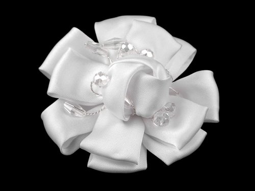 Brož saténový květ s broušenými kamínky Ø7 cm - bílá