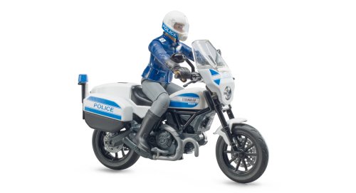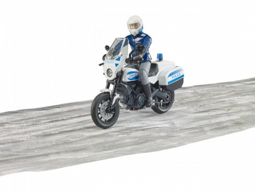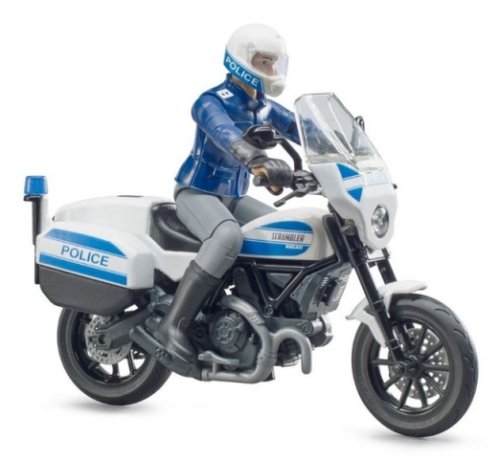 I v Bruder světě je potřeba dohlížet na dodržování zákonů a to zajistí např. sada Bruder 062731 Policejní motorka Ducati Scrambler s policistou, který dostihne každého zločince. Speciálně upravený policejní motocykl Ducati Scrambler lze řídit pomocí řidítek a po zastavení lze sklopit stojánek a udržet tak stabilitu stojící mašiny. Na motorce Bruder 62731 bude strážce zákona rychlý jako vítr a neunikne mu žádný lupič. Figurka policisty má pohyblivé končetiny a je vybavena přilbou a rukavicemi. Vyrobeno v Německu, z kvalitních materiálů. Hlavní vlastnosti: motorka s policistoufigurka s pohyblivými končetinamipřilba, rukavicevyrobeno v Německu
