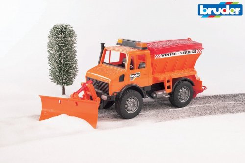 BRUDER 2572 - Mercedes Unimog pro zimní práce s radlicí - sypač. Auto sloužící proti přívalům sněhu v zimě pro silniční služby. Tento překrásný model disponuje velkým množstvím detailů a funkčních částí. Například je vybaven čelní radlicí na odklízení sněhu, rozmetačem drtě nebo posypového materiálu (vzadu na spodku vozu jsou umístěny dvě vrtule, které se při pohybu točí a rozmetají posypový materiál. Radlice je otočná a odnímatelná. Sypač je dále vybaven zadním rozmetadlem, možností odklopení krytu korby a přední kloubovou nápravou. Vhodným doplňkem pro toto auto je Maják se světlem+siréna BRUDER BR2801. Vyrobeno v Německu, z kvalitních materiálů..Hlavní vlastnosti: mnoho detailů a funkčních částíodnímatelná otočná radlicezadní rozmetadlovýklopný kryt motorupřední kloubová nápravavyrobeno v Německu