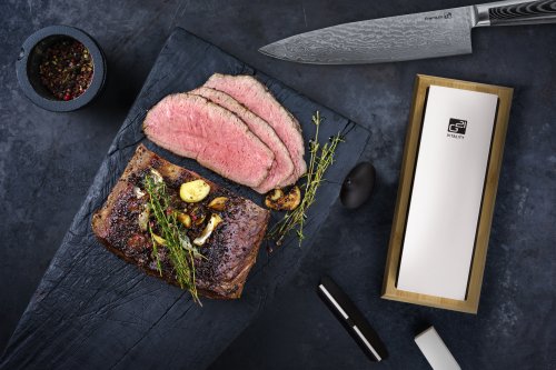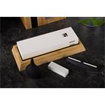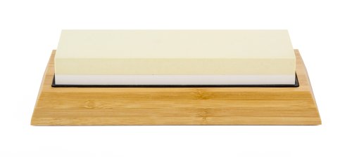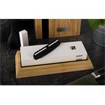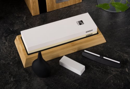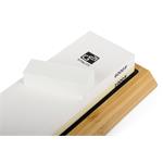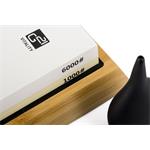 Brusný kámen z korundu je uložen v bambusovém bloku s výřezem na míru. V balení naleznete i keramické hladítko pro srovnání a zahlazení povrchu kamene po broušení, nechybí ani praktické a šikovné vodítko s nastaveným úhlem broušení (15 °) nebo balonek pro dávkování vody či oleje k broušení.