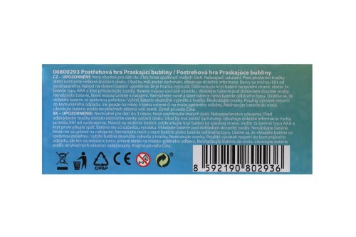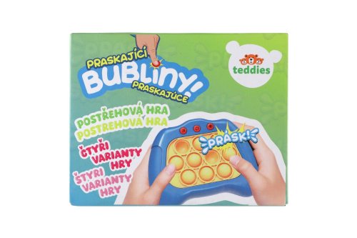 Cílem této hry je co nejrychleji pochytat svítící tlačítka tak, aby světlo zhaslo. Hra má několik herních módů. Baterie 3x AAA nejsou součástí výrobku. 4 módy hry: 1, STAGE MODE - STUPŇOVKA - Co nejrychleji vytlač bubliny, které svítí. Tento počet se postupně zvyšuje. 2, MEMORY MODE – PAMĚŤOVKA - Pamatuj si, které bubliny se rozsvítí a po jejich zhasnutí zmáčkni přesně ty ve stejném pořadí a znovu vytlač bubliny stlačením zadní částí hry a tím se dostaneš do dalšího kola. 3, SCORING MODE – RYCHLOVKA - Co v nejkratším čase vymačkej postupně všechny svítící bubliny. Po dokončení vytlač bubliny stlačením zadní částí hry a tím se dostaneš do dalšího kola. 4, MULTILAYER MODE – KOLOVKA - Po každém bezchybně splněném kole se přidá obtížnost o jednu bublinu navíc. Rozměry balení 13 x 10,5 x 5,5 cm. Vhodné pro děti od 3 let.