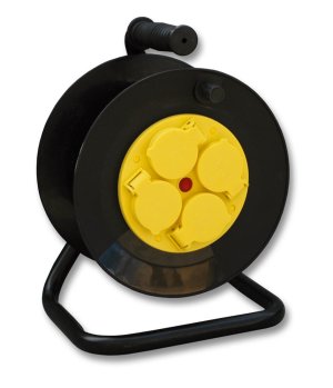 Černý prodlužovací kabel na navinovacím bubnu pro vnitřní i vnější použití se zvýšenou ochranou IP. Disponuje 4 zásuvkami, tepelnou pojistkou, dětskými clonkami a kabelem s průřezem 1,5 mm2. Zásuvky a zástrčka jsou vyrobeny z plastu, izolace je gumová.