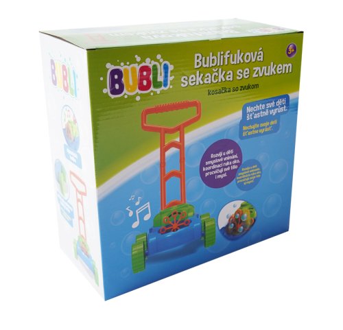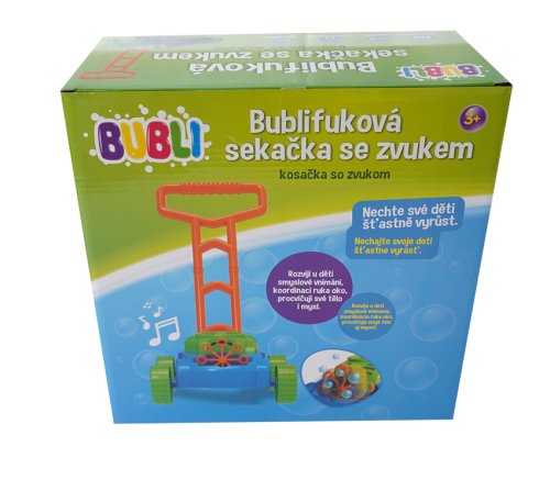 Místo klasického žacího ústrojí má tato sekačka speciální mechanismus na výrobu bublin. Ze sekačky se při jízdě valí nepřetržitý proud bublin.