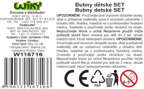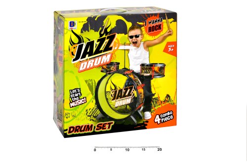 Sada trí bubnu vcetne basového kopáku s nožním pedálem a kovovým cinelem. https://www.youtube.com/watch?v=_ayVBOzGdQU