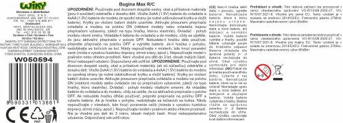 Bugina Max RC na dálkové ovládání. Rozměry 22x11x9,5 cm. Frekvence 27MHz. Rychlost 15 km/h. 4xAA baterie do buginy, 2xAA do ovladače nejsou součástí. Přepínač ON/OFF na spodní straně auta.