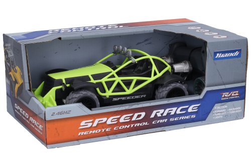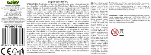 Bugina Speeder RC na dálkové ovládání. Velikost 22 cm. Frekvence 2.4GHz. Pistolový ovladač. Vydává světelné efekty. 4xAA baterie do auta, 2xAA do ovladače nejsou součástí. Přepínač ON/OFF na spodní straně buginy a na ovladači.