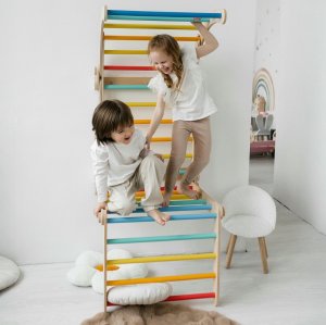 Mít vlastní herní park přímo doma to je sen každého dítěte. A co teprve žebřinovou horolezeckou stěnu s hrazdou na konci! Tato velká lezecká stěna je vhodná pro menší děti i pro ty, které už rády zdolávají výšky. Žebřiny se skládají ze třech prvků. Dvou trojúhelníků a jednoho balančního oblouku. Velký trojúhelník má rozměry 51,5 x 63,5 x 66 cm (výška × hloubka × šířka), malý trojúhelník 31,5 × 63,5 × 43,5 cm (výška × hloubka × šířka) a balanční oblouk je o rozměrech 21 × 63,5 × 75 cm (výška × hloubka × šířka). Tato velká lezecká sada pro děti kombinuje 2 trojúhelníky a malou houpací desku s možností upevnění na stěnu. Sestavu je možné použít na zemi k plazení, stání, lezení a ke zkoušení různých variací hry dle věku a dovedností a speciální stěnové upevnění pak transformuje tento modul na skutečnou horolezeckou stěnu, která je ideální pro rozvoj motorických dovedností. Díky variabilnímu designu bude tato sada růst spolu s dítětem, od plazení a lezení až po náročnější horolezecké výzvy.Produkt je vyroben z kvalitní březové překližky, barevné odchylky, suky či drobné opravy ve dřevě jsou přirozené a dodávají výrobku jedinečný charakter.Sadu je možné doplnit také o BKCT01A01 Odnímatelnou desku, díky které je možné vytvořit na žebřinách stoleček. Hlavní vlastnosti: multifunkční využitínosnost 100 kgvzdálenost mezi příčkami je 8,5 cmtrénuje motoriku a rovnováhuskvělý doplněk do dětského pokoje či herny