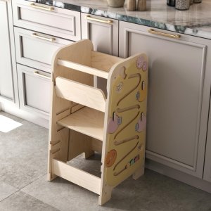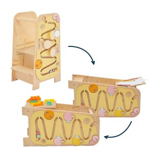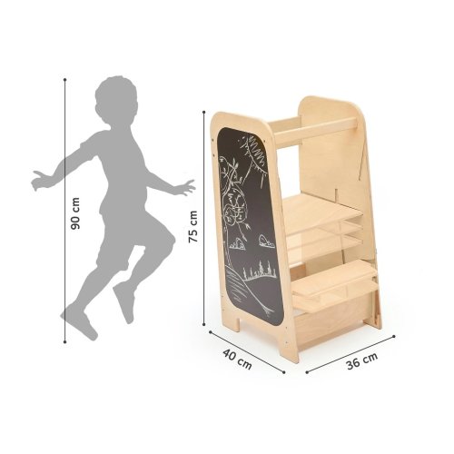 Představujeme rostoucí učící věž BusyKids Play 5v1 – multifunkční nábytek navržený podle principů Montessori, který roste společně s vaším dítětem. Umožňuje dětem bezpečně dosáhnout výšky dospělých a zapojit se do každodenních aktivit, jako je mytí rukou, vaření nebo pomoc v kuchyni. Díky promyšlenému designu nabízí tato věž až 5 různých funkcí. Podporuje samostatnost, kreativitu a přirozené učení hrou. Věž lze navíc jednoduše otočit a proměnit na dětský stolek se židličkou, což z ní dělá praktický kus nábytku do každého dětského pokoje. Po stranách věže se nachází tabule na kreslení křídou a hrací prvky, které děti zabaví a zároveň rozvíjejí jejich fantazii. Díky nastavitelným výškám plošiny a schodů lze věž přizpůsobit růstu dítěte. Produkt je dodáván v demontovaném stavu - obsahuje montážní nářadí a návod k montáži. Montáž je jednoduchá a zvládnete ji během několika minut. Při používání nenechávejte učící věž v prostoru, ale vždy věž umístěte stranou naproti schůdku k pevné překážce (kuchyňská linka apod.). Upozornění:Prodejem učící věže nepřebíráme odpovědnost za bezpečnost dítěte. Dítě na učící věži musí být pod stálým dozorem dospělé osoby! Technické parametry: rozměry věže: 75x39,5x39 cm (výška x šířka x hloubka)rozměry schůdku: 37x10 cm (šířka x hloubka)rozměry plošiny: 37x30 cm (šířka x hloubka)výška plošiny: 29 cm / 34 cm / 39 cm (3 nastavitelné úrovně)výška prvního schodu: 17 cm / 22 cm (2 nastavitelné úrovně) Hlavní vlastnosti: multifunkční učící věž 5v1podporuje samostatnost a zapojení dítěte do běžných aktivit3 nastavitelné výšky plošiny2 nastavitelné výšky schodkulze přeměnit na dětský stolek a židličkuboční tabule na kreslení křídouvyrobena z kvalitní březové překližkybezpečné barvy a laky vhodné pro dětistabilní konstrukce s nosností až 90 kgvhodné pro děti od 3 let Značka a certifikát FSC® (Forest Stewardship Council) zaručuje, že dřevo, ze kterého byl produkt vyroben, nebylo vytěženo nelegálně a pochází z lesů obhospodařovaných šetrným či přírodě blízkým způsobem, ve kterém jsou dodržovány přísné environmentální a sociální požadavky. Značka FSC® na výrobku znamená, že svým nákupem pomáháte chránit lesy a podporujete šetrné, odpovědné či přírodě blízké hospodaření, díky kterému jsou naše lesy stabilnější, zdravější, mají přirozenou druhovou skladbu a lépe odolávají negativním následkům klimatických změn.