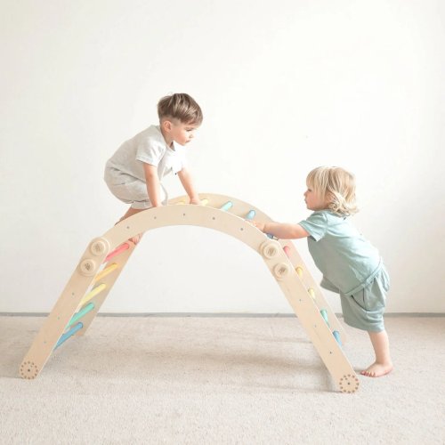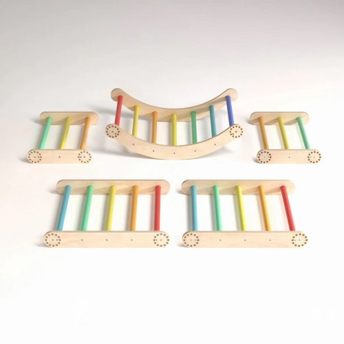 Mít vlastní herní park přímo doma to je sen každého dítěte. Tato velká lezecká sada nabízí desítky variant sestavení, které snadno změníte bez použití nářadí. Je vhodná pro menší děti i pro ty, které už rády zdolávají výšky. Díky kombinaci přírodního dřeva a nádherných duhových barev se stane atraktivní součástí dětského pokoje nebo herny.Sestava se skládá ze třech prvků. Dvou trojúhelníků a jednoho balančního oblouku. Velký trojúhelník má rozměry 51,5 x 63,5 x 66 cm (výška × hloubka × šířka), malý trojúhelník 31,5 × 63,5 × 43,5 cm (výška × hloubka × šířka) a balanční oblouk je o rozměrech 21 × 63,5 × 75 cm (výška × hloubka × šířka). Produkt je vyroben z kvalitní březové překližky; barevné odchylky, suky či drobné opravy ve dřevě jsou přirozené a dodávají výrobku jedinečný charakter. Hlavní vlastnosti: multifunkční využitínosnost 80 kgvzdálenost mezi příčkami je 8,5 cmtrénuje motoriku a rovnováhuskvělý doplněk do dětského pokoje či herny
