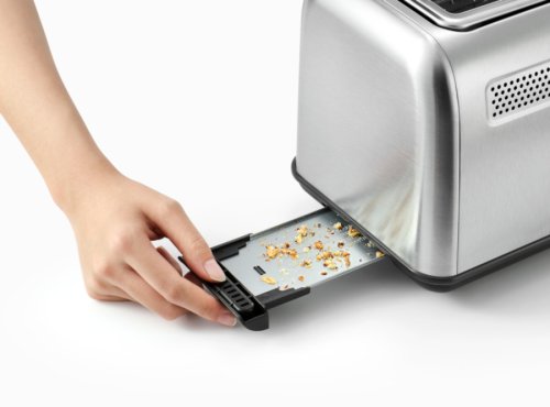 Rychlé vaření se zvedací spínací pákou pro snadný přístup, s vyjímatelnou miskou na drobky pro snadné čištění a skrytem proti prachu, s úložným prostorem pro kabel ve spodní části.