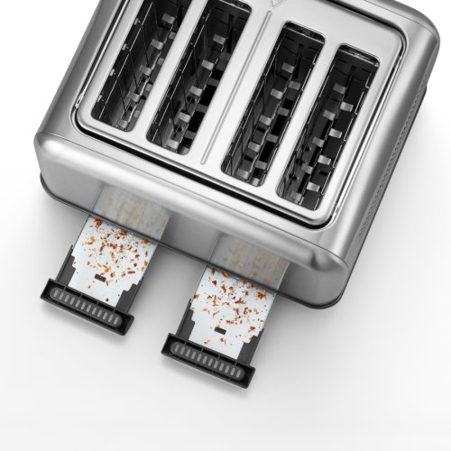 Rychlé vaření se zvedací spínací pákou pro snadný přístup, s vyjímatelnou miskou na drobky pro snadné čištění a skrytem proti prachu, s úložným prostorem pro kabel ve spodní části.