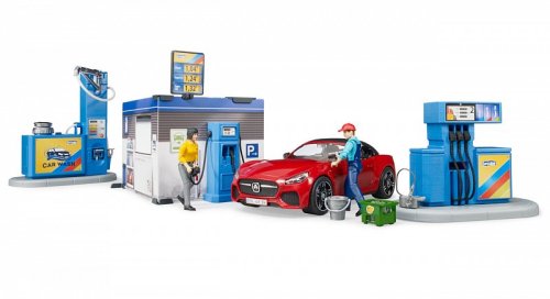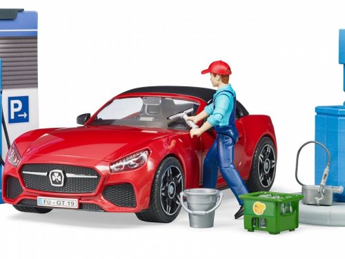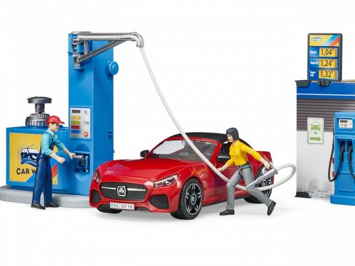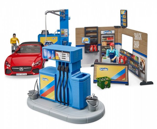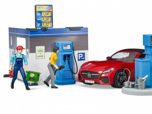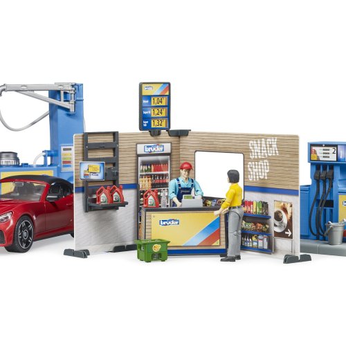 Každé auto Bruder přeci potřebuje mít kde natankovat, nebo se nabít. A nejen to, řidič se přeci také potřebuje občerstvit a přivítá možnost své auto i umýt. Vhod přitom jistě příjde vstřícná profesionální obsluha. S modelem čerpací stanice se všechny tyto možnosti nabízí. Mycí linka je přitom plně funkční, stačí doplnit vodu do zásobníku a stisknout tlačítko! Kulisy stanice jsou detailně oboustranně potištěny a opatřeny funkčními podrobnostmi, policí s kanystry a ceníkem. Součástí sady je i další drobné příslušenství, přepravka, parní čistič a vědro se stěrkou k mytí oken. Variabilní sportovní auto má odnímatelná kola i střechu a je samozřejmě kompatibilní s figurkami Bruder BWORLD. Vyrobeno v Německu, z kvalitních materiálů. Hlavní vlastnosti:pumpa, myčka, stanice, auto a 2 figurky2 oboustranně potištěné stěny stanice s poutačem, policovým dílem a pokladním pultem3 kanystry, vědro se stěrkou, parní čistič a přepravka s lahvemimyčka je funkční, lze ji plnit vodouodnímatelná kola a střecha autakompatibilita s BWORLD příslušenstvímvyrobeno v Německu