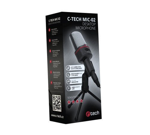 C-TECH MIC-02 je vysoce kvalitní mikrofon s přirozenou kvalitou reprodukce hlasu pro každodenní použití. Své uplatnění najde jak při použití s komunikačními programy, tak i při vytváření youtube videí nebo live přenosů. Mikrofon se připojuje pomocí 2,5m kabelu s pozlaceným stereo konektorem jack 3,5mm, v balení však naleznete i redukci jack stereo 3-pin/4-pin pro připojení mikrofonu k zařízení, které je vybaveno sloučeným audio konektorem pro mikrof a sluchátka. Mikrofon je vybaven zapínacím tlačítkem s regulací hlastitosti. V balení naleznete praktický podstavec (tripod), díky kterému lze umístit mikrofon do různých poloh.