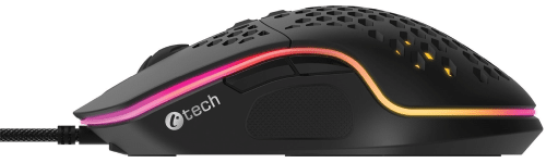 Ultralehká herní myš C-TECH Scarab vaše hraní podzvedne na vyšší úroveň. Hned na první pohled vás upoutá propracovaným elegantním tvarem a RGB podsvícením. Myš je vybavena optickým snímačem Instant 725F s maximálním rozlišením 7200 DPI. Změnu rozlišení provedete velmi jednoduše pomocí tlačítka DP, a to hned v 6 úrovních. Přičemž každá úroveň je při přepnutí signalizována 1sekundovou barevnou indikací. 5 tlačítek pro rychlou a kontrolovanou hru. Další 2 tlačítka jsou pro změnu DPI a volbu RGB režimu osvětlení. 4 RGB módy s 16.8 miliony barev. Výsledkem je myš – skvěle ovladatelná, která oživí váš stůl nejen při hraní her, ale i při kancelářské práci. Pohodlný úchop zajišťuje pogumovaný povrch horní části. Myš C-tech Scarab je díky své ergonomii vhodná pro praváky a k počítači ji připojíte 1,5m opleteným kabelem s USB konektorem.