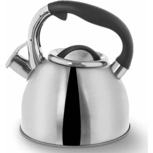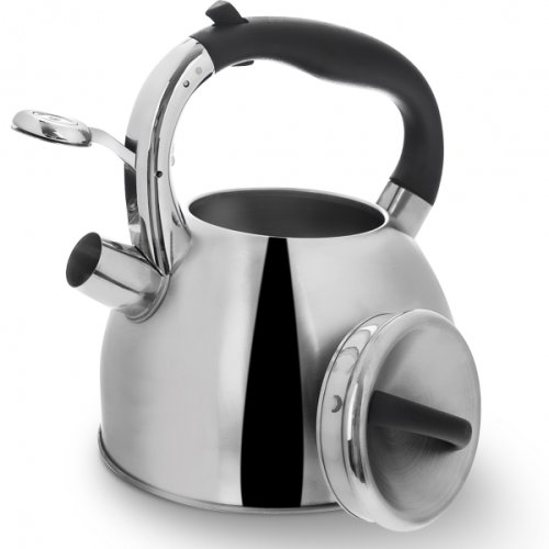 Moderní matný nerezový čajník s černými plastovými prvky, je opatřen odklápěcí píšťalkou, která ohlásí vařící se vodu .