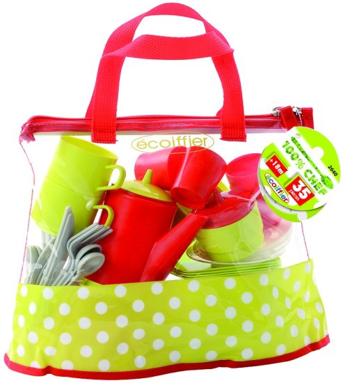 Velká průhledná taška se zipovým zavíráním obsahuje čtyři talíře, sadu čtyř příborů, čtyři pohárky, čtyři plastové hrníčky s podšálky, konvičku, cukřenku, síto a hrnec s pokličkou. Vše plastové. Vhodné pro děti od 18 měsíců. Velikost tašky 29x12x30 cm.