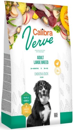 Kompletní granulované krmivo s čerstvým kuřecím masem bez obilovin pro dospělé psy velkých plemen s hmotností nad 30 kg. Receptura je postavena jako kompletní suché krmivo s 30 % čerstvého kuřecího masa a kvalitním kachním proteinem, které zaručují psovi optimální dávku kvalitní výživy. Krmivo odpovídá nejvyšším požadavkům na přirozené stravování psa v souladu s jeho fyziologickými potřebami. Čerstvé maso je vysoce výživným zdrojem bílkovin, vyznačuje se atraktivní chutí a je vhodné i pro citlivé zažívání. Bezobilninová receptura je skvěle stravitelná. Obsahuje kvalitní zdroje proteinu, které jsou z 70 % živočišného původu, a také adekvátní množství sacharidů a vlákniny, je energeticky pečlivě vyvážená. Hlavní výhody Calibra Dog Adult Large Chicken & Duck: TRIPLE ACTIVE FORMULA – unikátní kombinace vybraných funkčních aditiv.