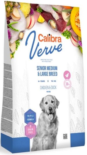 Kompletní granulované krmivo s čerstvým kuřecím masem bez obilovin pro dospělé psy nad 6 let středních a velkých plemen o hmotnosti 10-90 kg. S obsahem 30 % čerstvého kuřecího masa v kombinaci s luxusním kachním proteinem je to krmivo, které odpovídá nejvyšším požadavkům na přirozené stravování psa, v souladu s jeho fyziologickými potřebami. Adekvátní výživa pro zralého psa je doplněna o zvýšené množství chondroprotektivních látek pro namáhané klouby větších pejsků. Čerstvé maso je vysoce výživným zdrojem bílkovin, který se vyznačuje atraktivní chutí, a je vhodné i pro citlivé zažívání. Grain free receptura je skvěle stravitelná, obsahuje kvalitní zdroje proteinu, které jsou z 65 % živočišného původu, a také adekvátní množství sacharidů a vlákniny, je tudíž energeticky pečlivě vyvážená. Hlavní výhody Calibra Dog Verve GF Senior Medium & Large Chicken & Duck TRIPLE ACTIVE FORMULA – unikátní kombinace vybraných funkčních aditiv.