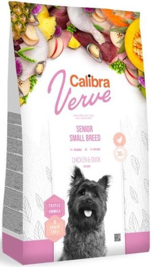 Kompletní granulované krmivo s čerstvým kuřecím masem bez obilovin pro dospělé psy nad 7 let malých plemen s hmotností 1-10 kg. Krmivo s 30 % čerstvého kuřecího masa a kvalitním kachním proteinem je adekvátní výživou pro staršího psa, která odpovídá nejvyšším požadavkům na přirozené stravování v souladu s fyziologickými potřebami. Čerstvé maso v receptuře je vysoce výživným zdrojem bílkovin, který se vyznačuje atraktivní chutí a je vhodné i pro citlivé zažívání. Tato bezobilninová receptura je skvěle stravitelná, obsahuje kvalitní zdroje proteinu z 70 % živočišného původu, adekvátní množství sacharidů a vlákniny, je tudíž energeticky pečlivě vyvážená. Hlavní výhody Calibra Dog Senior Small Chicken & Duck TRIPLE ACTIVE FORMULA – unikátní kombinace vybraných funkčních aditiv.