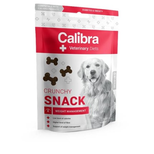 Veterinární diety svému mazlíčkovi nepodávejte bez doporučení veterináře! S veterinářem byste měli také nejméně jednou za 6 měsíců konzultovat, zda v užívání krmiva pokračovat. Pokud se během užívání diety stav vašeho mazlíčka jakýmkoli způsobem zhorší, kontaktujte svého veterináře ihned. Veterinární pamlsky kompatibilní s indikacemi: Diabetes mellitus, redukce nadměrné hmotnosti, kontrola hmotnosti. Kompatibilita veterinárních pamlsků Calibra s veterinárními dietami umožňuje výbornou kombinaci krmení veterinární dietou a použití odměny pro psa. Jedinečné složení a parametry pamlsků pokrývají nutriční požadavky těchto indikací veterinárních diet. Pamlsky obsahují čerstvé maso pro skvělou chutnost. Receptura Weight Management Crunchy Snack je kompatibilní také s veterinární dietou Calibra VD Dog Diabetes & Obesity. Benefity receptury Weight Management Crunchy Snack: