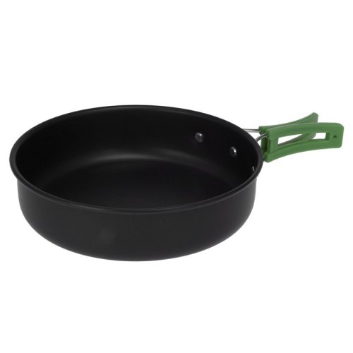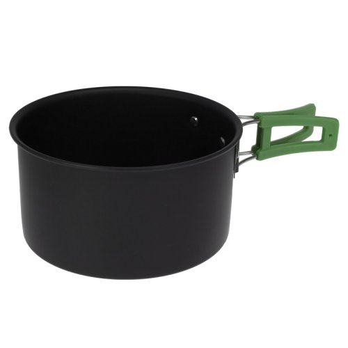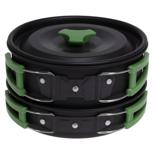 sada kastrolů, eloxovaný hliník s rukojeťmi z nerezové oceli 201, sada 3ks: pánev s poklicí (178x90mm), pánev (180x43mm), konvice s poklicí (151x75mm, 1000ml), skládací rukojeť v zelené barvě, sada balená v černém pouzdře