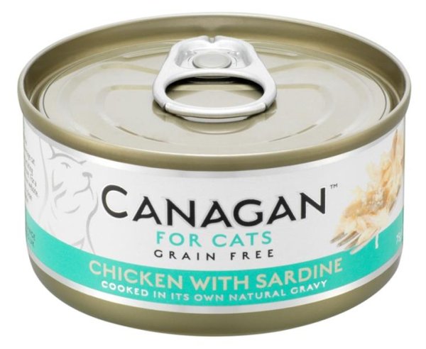 Canagan Cat Chicken with Sardine – je kompletní krmivo pro kočky. Vyrobené je z čerstvého kuřecího masa bez kůže. Kuře doplňují lahodná sousta sardinek – vše šetrně vařené ve vlastní šťávě pro zachování vysoké výživové hodnoty krmiva. Stejně jako v ostatních výrobcích značky Canagan, ani v těchto konzervách pro kočky nenajdete žádné obiloviny. Konzervu můžete Vaší kočce podávat samostatně nebo v kombinaci s granulemi, nezapomeňte však upravit podávané množství. Složení: Kuřecí prsa (58 %), kuřecí vývar (32 %), sardinky (5 %), maniok, slunečnicový olej, vitamíny a minerály. Nutriční doplň.látky (kg): taurin 648,2 mg, trikalcium fosfát 4078 mg, síran zinečnatý 227 mg, cholin chlorid 1037 mg, síran železnatý 52 mg, vitamin A 10370 m.j., jodid draselný 6,5 mg, síran manganatý 6,5 mg, síran měďnatý 6,5 mg, vitamin D3 1944 m.j. Analytické složky: Vlhkost 77 %, hrubý protein 19 %, obsah tuku 1,2 %, hrubý popel 1,3 %, hrubá vláknina 0,05 %. Dávkování: 2-3 konzervy jsou optimální pro průměrnou kočku. Koťata, březí a kojící kočky mohou potřebovat více krmiva. Doporučené krmné dávky jsou pouze orientační, podávané množství krmiva je třeba přizpůsobit věku, aktivitě, prostředí i kondici vaší kočky. Kočka musí mít vždy přístup k čisté a čerstvé vodě.