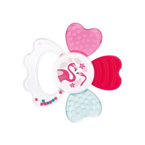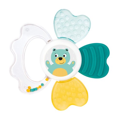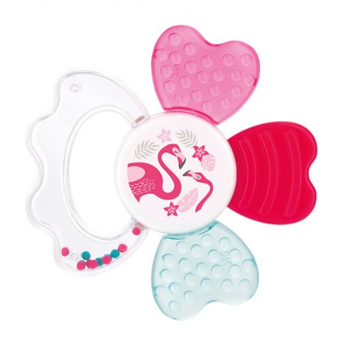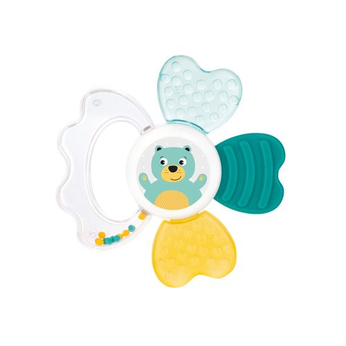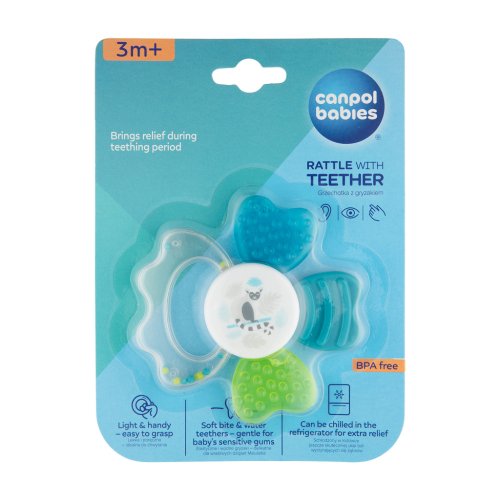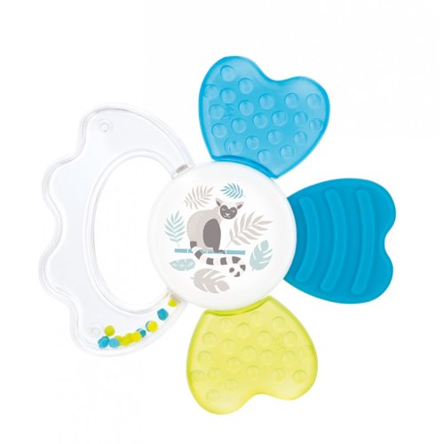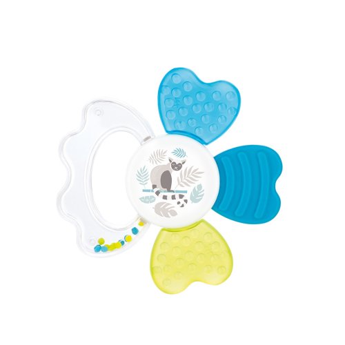 Chrastítko s kousátkem je určeno dětem od tří měsíců. Kombinuje výhody pružného kousátka a chrastítka, protože obsahuje velké měkké části, které poskytují úlevu při růstu zoubků. Atraktivní tvary a intenzivní barvy přitahují pozornost dítěte. Měkké části jsou přizpůsobeny pro jemné dětské dásně. Chrastítka jsou vyrobena z odolných a bezpečných materiálů (bez ostrých hran). Před podáním dítěti můžete ochladit v ledničce. To pomůže uklidnit dásně dítěte.