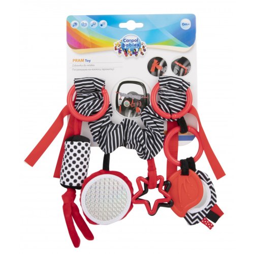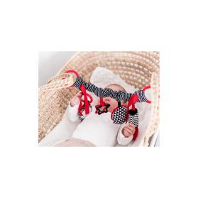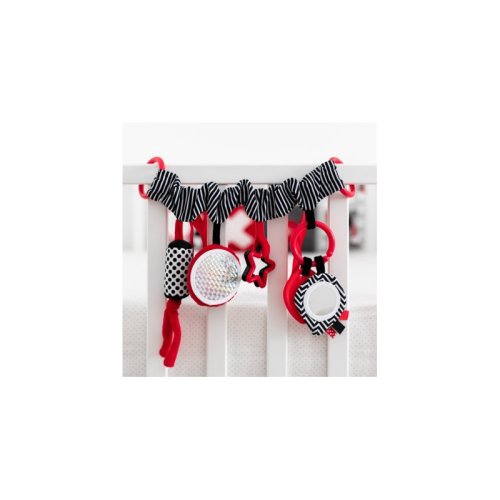 Kontrastní závěsná hračka na kočárek/autosedačku SENSORY. Závěsná hračka se zrcátkem je vhodná již pro nejmenší děti. Hračka má dvě možnosti uchycení a lze jí umístit na kočárek, autosedačku nebo postýlku. Různé textury materiálů stimulují hmat dítěte. Zvonění a šustění materiálů upoutává dětskou pozornost. Vícebarevné stuhy povzbuzují dítě, aby je chytilo. Elastická kousátka zklidňují dásně dítěte při růstu zoubků. Senzorické barvy stimulují rozvoj smyslů dítěte.